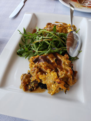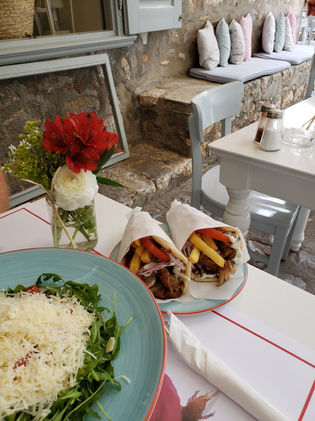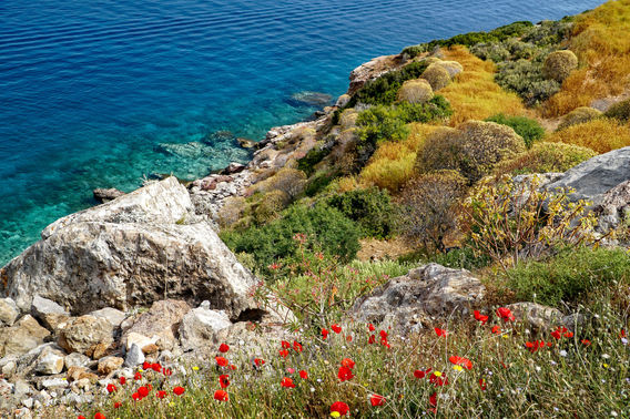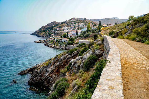 Our hotel provided a breakfast fit for kings! We sat down and dish after dish was delivered to us. When we couldn't possibly eat any more, we thanked our hosts and headed out on a walk. David W. had offered a guided walk around Hydra, but David and I had decided to strike out on our own instead. We hiked a trail along the water with gorgeous views to reach a beach a few miles over. The water was the most beautiful, rich color, which stood in perfect contrast to the rolling yellow grass hills covered with pops of read from the wildflowers. After wading in the clear turquoise water to cool off, we wandered back and found a place for lunch with seaside views and relaxed, enjoying some stuffed mushrooms and Greek salad.